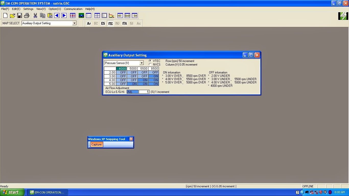 Katakan, semasa boosting, Fuel Cut, bacaannya 4.9 volt. Pada ruang Boost Limit Setting, kita hanya perlu mengecilkan nilai volt. Katakan samasa Fuel Cut, RPM adalah 5000. Jadi, start 5000 hingga 8000 RPM (sampai limit RPM), voltage diubah kepada 4.7 volt.
